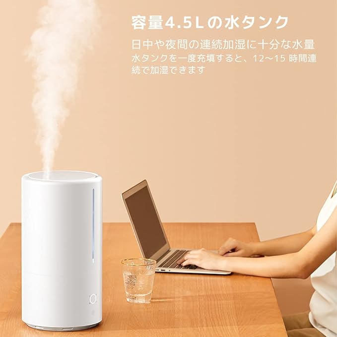 基本的な構造としては、タンク容量が結構大きめの4.5リットルで、1度の給水で12時間から15時間の連続動作が可能。また、本体のボタンはシンプル(多くない)ながらも、実はWifi経由でスマートフォンから加湿量の操作や状態確認が可能な凄いヤツだったりします。