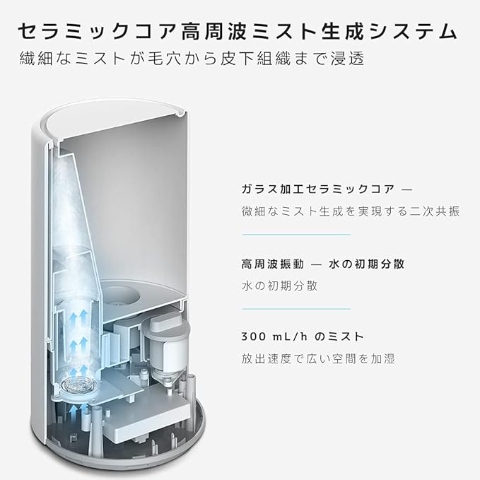 超音波式は加湿機能が高いメリットがありつつも、「蒸気式に比べて雑菌が繁殖しやすい」ことや「室温が下がってしまう」等のデメリットもあったりしますが、この加湿器は加湿時に水がUVランプの殺菌エリアを通過するため、新鮮で清潔な水だけが使用され健康に良いミストが放出されるので安心とのこと。